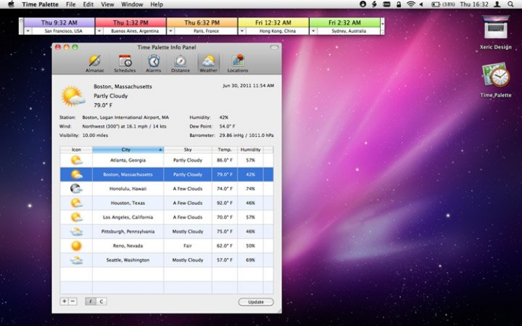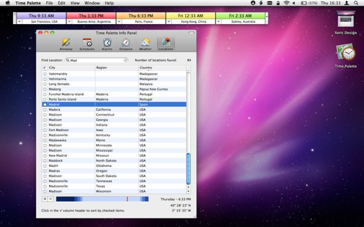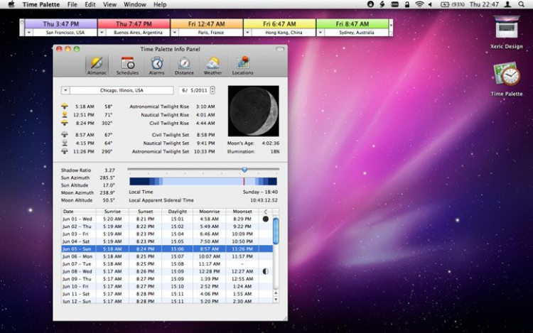 Time Palette Показывает местное время в любой точке земного шара. А также предоставляет информацию о погоде и циклах солнца и луны. Time Palette признана лидером в своем классе и может стать отличным помощником в международном бизнессе. Благодаря встроенному планировщику можно планировать международные телеконференции в удобное, для всех участников, время. Также можно устанавливать несколько будильников для разные часовых поясов.