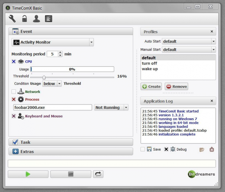 TimeComX Basic Это программа, которая поможет автоматизировать работу вашего компьютера. Она может автоматически выполнять заданное действие по истечении определенного времени, или при длительном простое компьютера. Данная программа может автоматически выключить или перезагрузить компьютер, перевести его в режим сна или гибернации, выйти из системы, воспроизвести звуковое оповещение (wav, mp3, wma), открывать файл(ы) или зайти на указанный веб-сайт. Любое из этих действий может быть выполнено по таймеру или когда активность ЦП или сетевого соединения опускается до определенного уровня. TimeComX Basic можно установить на флешку, в портативном режиме. Это позволить использовать ее на любом компьютере. ИЗ дополнительных функций программы стоит также упомянуть то, что она способна следить и записывать нажатые клавиши и действия мышью. Хотите автоматизировать работу своего компьютера? Скачайте TimeComX Basic с goida-soft.ru.