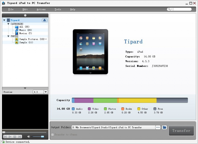 Tipard iPad to PC Transfer Standard Программа для передачи файлов с iPad на компьютер. С ее помощью можно копировать музыку, видео, картинки, фотографии, голосовые заметки, рингтоны. Программа имеет встроенный просмотрщик изображений и плеер для воспроизведения музыки и видео перед копированием. Есть возможность фильтрации файлов и функция ручного поиска. И все это заключено в простой и удобный интерфейс.