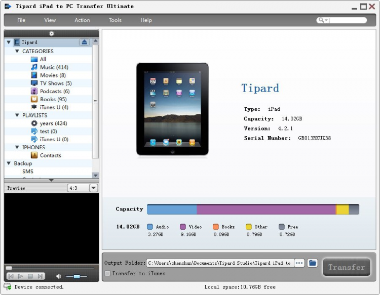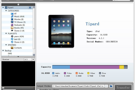 Tipard iPad to PC Transfer Ultimate Программа для передачи файлов с iPad на компьютер. С ее помощью можно копировать музыку, видео, картинки, подкасты, ТВ-передачи, электронные книги, SMS-сообщения, контакты, фотографии, голосовые заметки, рингтоны. Программа имеет встроенный просмотрщик изображений и плеер для воспроизведения музыки и видео перед копированием. Есть возможность фильтрации файлов и функция ручного поиска. И все это заключено в простой и удобный интерфейс.