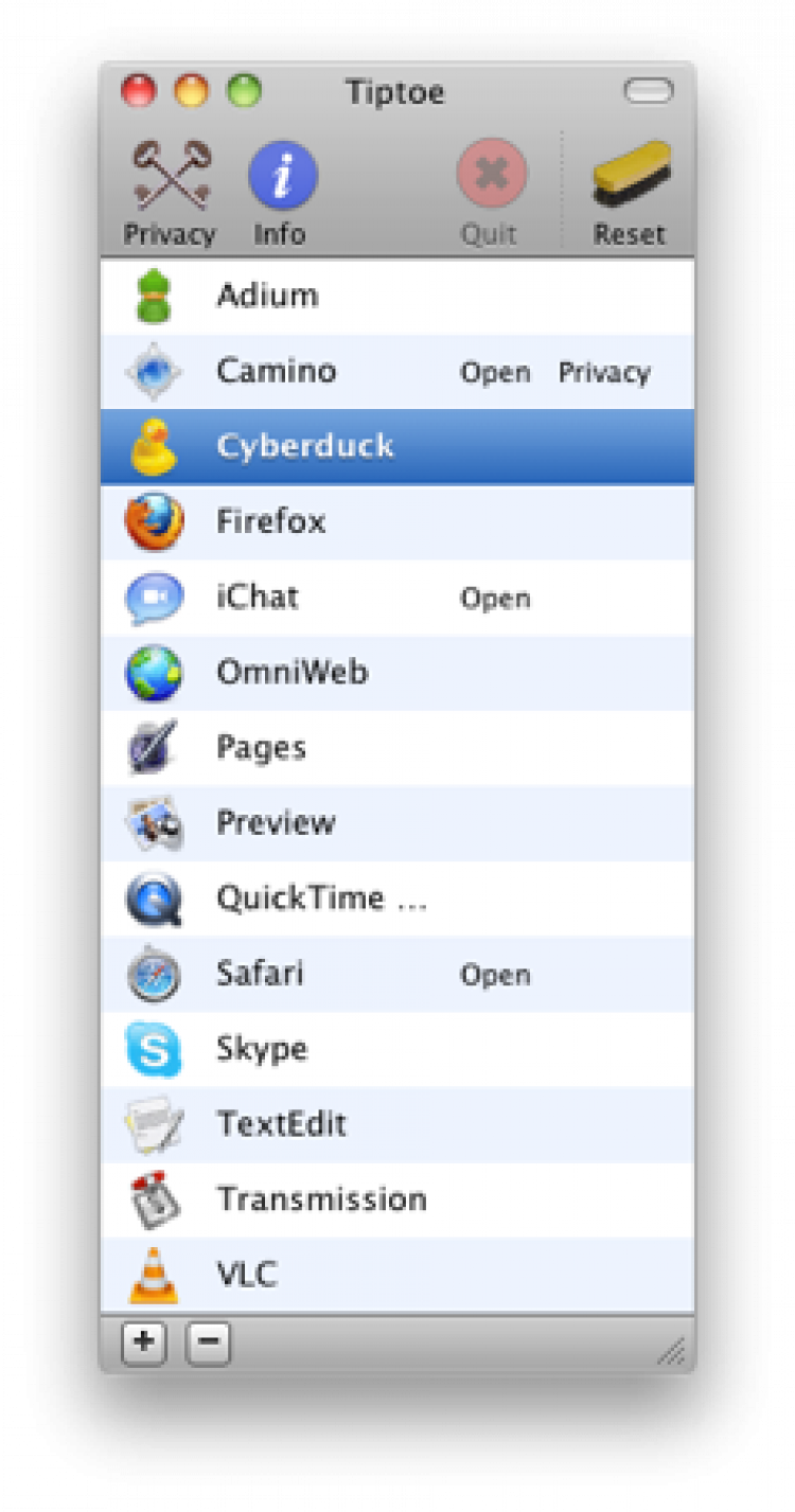 Tiptoe С этим приложением вы сможете чатиться, серфить интернет, просматривать видео и изображения и при этом не бояться, что в системе остануться следы вашей деятельности. Tiptoe заметет все следы. Она очисит кэш приложений, историю посещений, и список надавних документов.