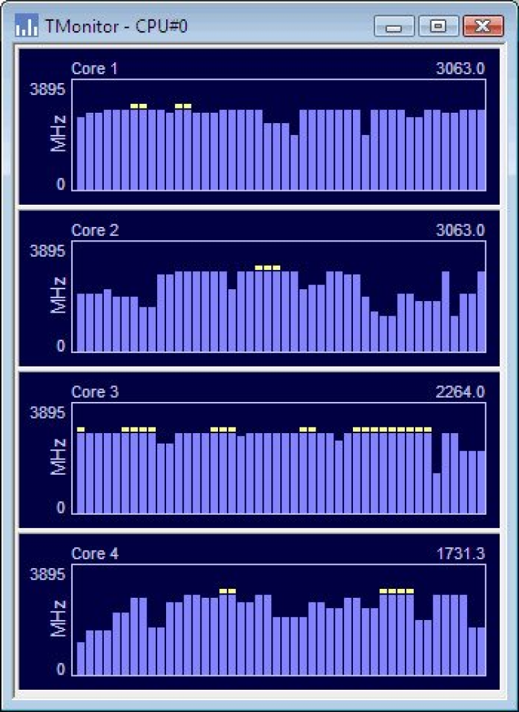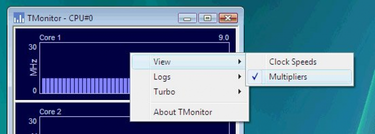 TMonitor - это программа, которая отображает в реальном времени частоту каждого ядра вашего процессора. Она работает с процессорами серии Intel Core 2 и Core i3/i5/i7, а также AMD K10. Она обладает высокой частотой обновления данных (20 раз в секунду), что позволяет визуализировать даже малейшие изменения частоты процессора. Программа распознает такие технологии, как Intel Turbo boost, и может в наглядном виде продемонстрировать их эффект на частоту центрального процессора.