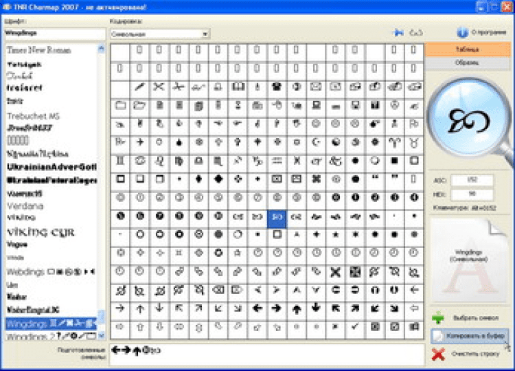 TNR Charmap 2007 - Таблица символов - это мощная альтернатива стандартной таблице символов. Наглядный список шрифтов, отображение названий шрифтов самими шрифтами (по аналогии c MS Office), большое увеличение символов, возможность просмотра разных кодовых страниц шрифта, возможность перетягивания выбранных символов в окна других программ (например Word); отображение ASCII и HEX-кодов символов и наоборот отображение символа по его ASCII или HEX-коду, просмотр образца текста (как в FontView) с возможностью изменения цветов текста и фона. Просто, удобно, красиво! Желательно БЕСПЛАТНО активировать программу на сайте разработчика.