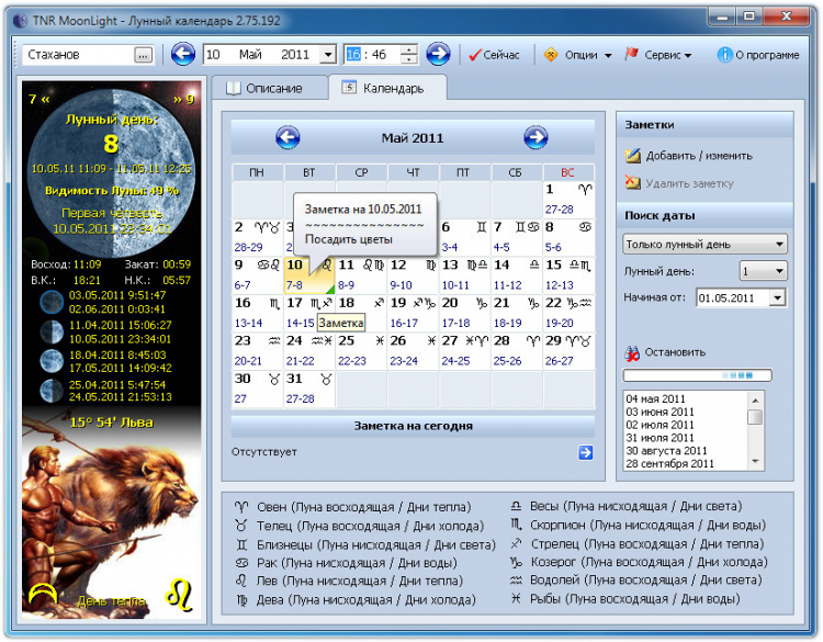 Позволяет производить поиск искомой фазы, лунных суток, зодиака в пределах 1000 лет. Имеет красивый интерфейс с поддержкой множества цветовых схем и разнообразных стилей отображения Луны в зодиаке. Может работать в виде значка системной панели, выводя основную информацию во всплывающей подсказке. Есть возможность добавлять заметки на календарные дни. Для снятия некоторых функциональных ограничений программы ТНР Мунлайт необходима БЕСПЛАТНАЯ активация на сайте разработчика.