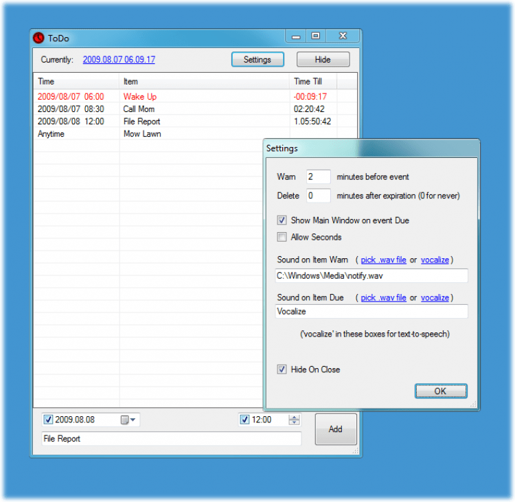 ToDo - это бесплатная утилита-напоминалка. Позволяет ставить будильники или напоминания о каких-либо делах, или может выступать просто к качестве будильника. Есть опция предварительного уведомления, возможность менять звуковые сигналы, автоматического удаления просроченные задач. Имеет очень просто интерфейс без лишних наворотов.