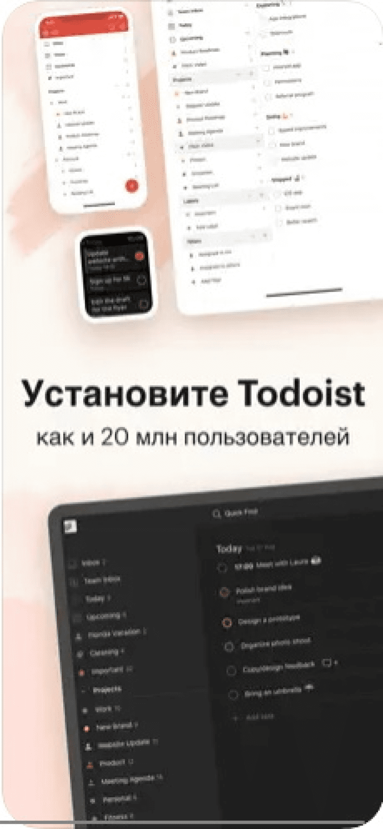 Приложение с идеальным производительным списком дел всегда там, где Вам нужно: на мобильном устройстве, десктопе, браузере, Gmail и пр. Признанный TechCrunch, NYT, Lifehacker, ReadWriteWeb и многими другими, Todoist прекрасно работает на всех Ваших устройствах (на десктопах, с веб-браузерами, клиентами электронной почты и мобильными), поэтому Вы сможете повысить свою производительность и каждый день делать больше.