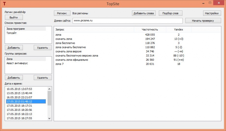 TopSite Программа для подбора ключевых слов через Яндекс wordstat и проверки позиций сайта в поисковых системах Яндекс, Google и Mail.