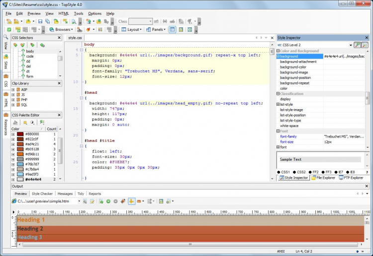 В TopStyle 5 есть функция автозавершения и автозамены кода, встроенный инспектор и валидатор, возможность просмотра веб-страницы прямо в редакторе, мощная цветовая палитра и пр. В редакторе можно работать с локальными файлами, и с файлами на удаленном FTP/SFTP сервере; после сохранения они автоматически загружаются на сервер.