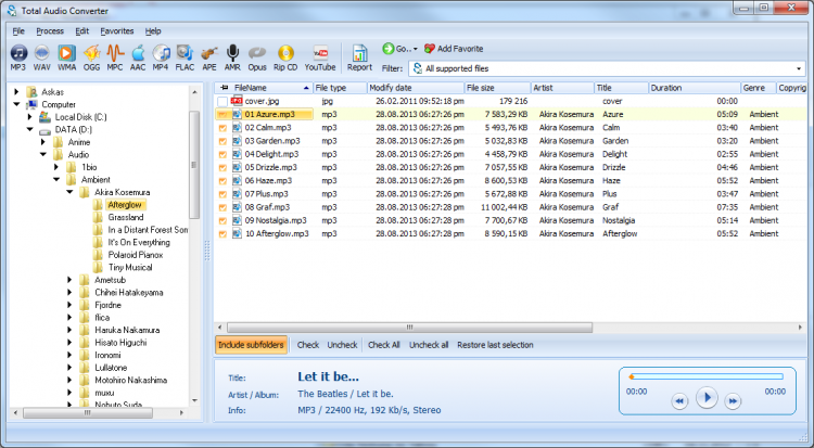В списке доступных функций присутствуют: поддержка ID3-тегов, адаптация битрейта под персональные запросы, работа с документами CUE, формирование семплов, активация стереорежима для оптимизации звучания. Загрузить Total Audio Converter – значит обеспечить возможность до мельчайших деталей контролировать характеристики аудио. Чтобы убедиться в правильности выбора мелодии, предусмотрен интегрированный эквалайзер. Назначение плеера – воспроизведение треков до изменения разрешения, поэтому разработчики снабдили его минимальным функционалом: линией прогресса и тремя клавишами («Прокрутка» «Вперед/Назад», «Пуск/Пауза»). После завершения конвертации пользователю остается выбрать место сохранения измененной мелодии.