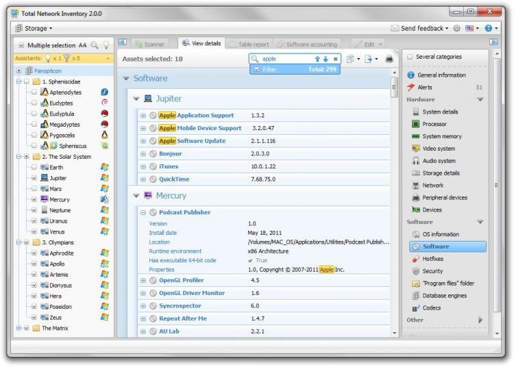 Total Network Inventory позволяет генерировать табличные отчеты с множеством полей по различным группам данных. Они могут быть скопированы, экспортированы или отправлены на печать. В программе так же предусмотрена возможность учета установленного на компьютерах ПО и лицензий. С ее помощью можно узнать количество копий и посмотреть список компьютеров, на которых оно установлено.