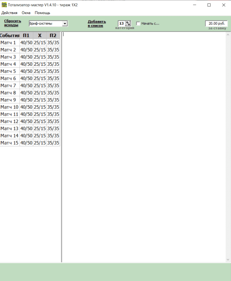 - Бриф-система (по умолчанию при старте). Выделите левой кнопкой мышки необходимые исходы из таблицы с матчами текущего тиража. В ячейках таблицы числа слева от дробной черты показывают букмекерские котировки на данный исход (шансы в %), справа - процент от всего пула, поставленных сумм на данный исход до текущего момента. Нажмите "Добавить в список". Если в окне "Категория" установлено 15, в список ставок попадает полный набор вариантов из всех возможных сочетаний отмеченных исходов. Иначе Тотализатор-мастер подбирает набор вариантов, гарантирующий выигрыш по выставленной категории (от 9 до 14) при условии того, что сыграют именно отмеченные исходы. (Шаблоны бриф-систем размещаются в папке "Kombin" в достаточно наглядном виде. Пользователи могут добавлять или изменять шаблоны самостоятельно.). Возможно построение бриф-системы, которая включает в себя определенную ставку. Для этого необходимо поставить отметку в квадратике "Начиная с...". Рядом появится строка с выборами обязательной ставки. Если в таблице матчей снять и снова отметить какой-то из исходов, этот исход войдет в обязательную ставку. В нижней части экрана выводятся количества ставок и необходимые суммы для простановки выбранных исходов целым купоном и бриф-системой. При отсутствии на текущее количество подстраховок шаблона выводятся ближайшие возможные системы. При необходимости в правом верхнем окошке можно задать не минимально возможную сумму ставки на один вариант, а больше.