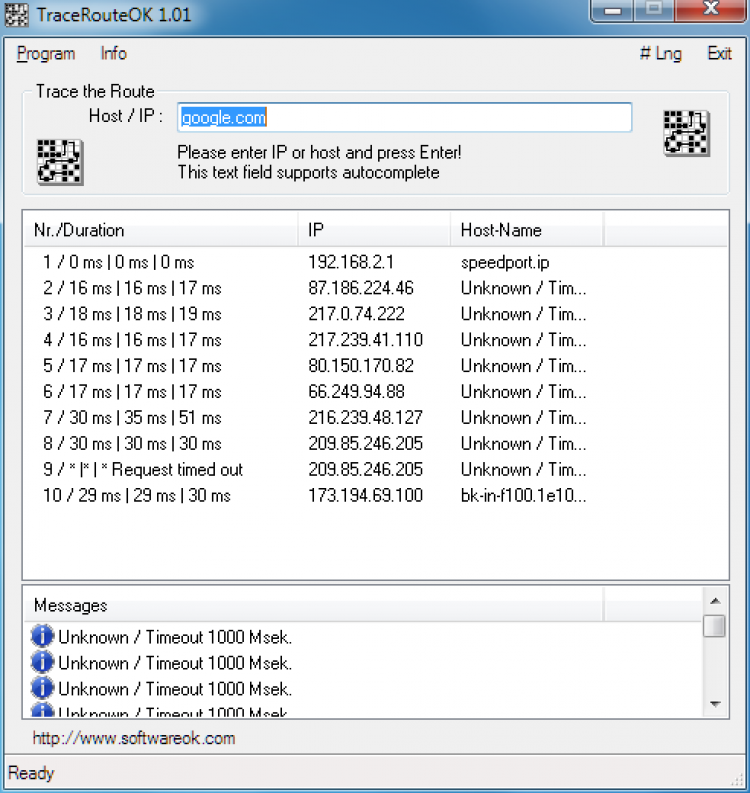 TraceRouteOK - это утилита, которая отслеживает перемещение пакетов данных в Интернете и локальной сети. С ее помощью можно быстро отследить маршрут запроса, вычислить время запроса переменного имена хоста, а также выбрать тайм аут для пингов. TraceRouteOK очень проста в настройке, и не требует установки.