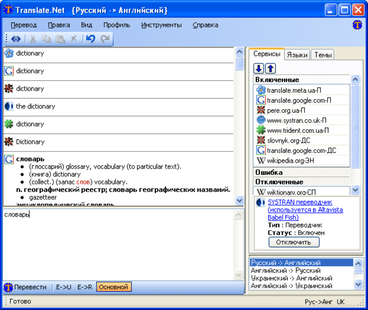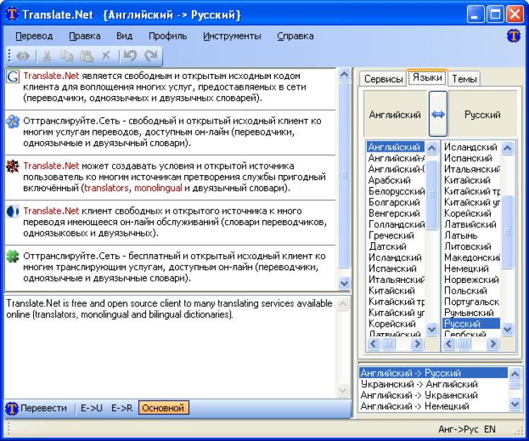 Translate.Net - это бесплатный словарь для Windows, который переводит слова и фразы по множеству направлений.