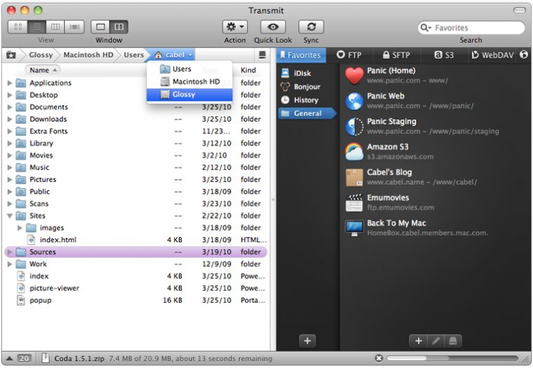 Еще одна причина, по которой клиенты стремятся загрузить Transmit — руководство избранными сайтами, часто используемыми папками и окнами через вкладки. Утилита интегрирована в компоненте Spotlight ОС macOS для прямого подключения к FTP-аккаунта и с мультимедийной программой iWeb для создания персональных веб-сайтов в режиме визуального редактирования.