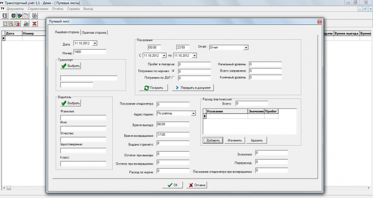 Транспортный учёт Программный продукт предназначен для ведения транспортного учёта. С возможностью формирования путевых листов, отчёта. Формируются путевые листы для легкового, грузового транспорта и автобусов. Используются типовые формы. Автоматическая нумерация. Путевой лист заполняется с двух сторон, расход топлива может считаться по разным нормам, выбранным из справочника норм расхода топлива. Все необходимые данные (информация о компании) автоматически вставляются в путевой лист. Текущее показание спидометра и остаток бензина автоматически подсчитывается и хранится в справочнике транспорта. Справочники водителей, автомобилей, нормы расхода топлива. Позволяет получить подробный отчёт по работе автомобилей и водителей. Бланки документов хранятся в формате ексель, при необходимости можно самому их отредактировать. От пользователя требуется ввод минимального набора данных – большинство информации вноситься из справочников. Есть возможность получения данных для путевого листа с сервера gps. Программа не требовательна к конфигурации компьютера.