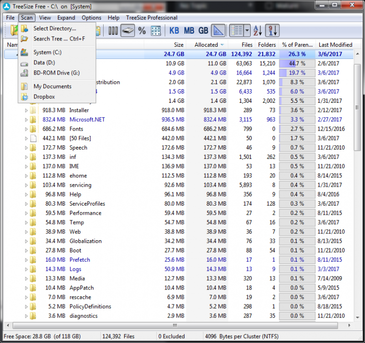 Программа способна сканировать целый диск, или только указанные папки. В любом случае, она составляет список содержимого, который содержит информацию о названии, размере, количестве файлов и файлов и дате последнего изменения. Правый клик по файлу/папке раскрывает стандартное меню Проводника, так что копировать, удалять, перемещать и выполнять другие привычные операции можно непосредственно из программы.