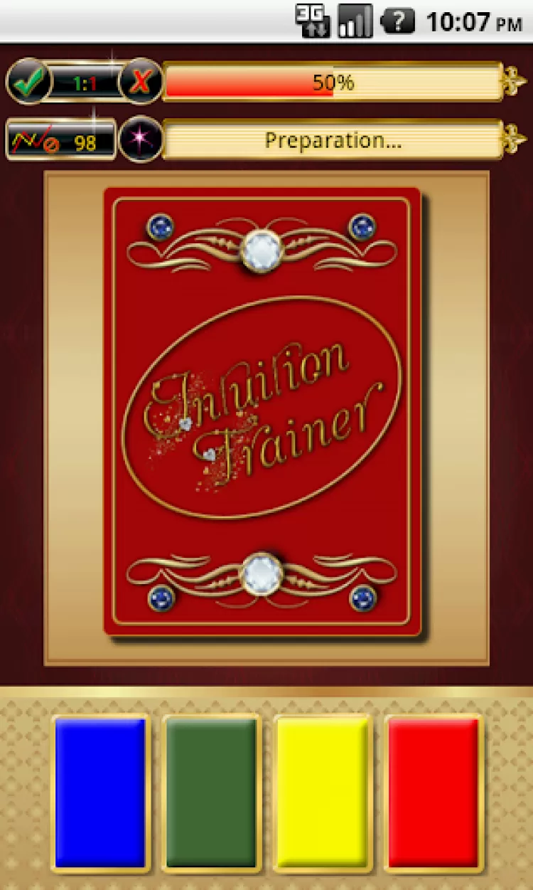 Программа иммитирует тренировочные карты, один из эффективных способов разбудить в себе скрытые возможности. Идея проста: загадывается карта, наша задача почувствовать цвет. Как обычно, при тренировке с двумя картами, результат близкий к 50% означает, что ваша интуиция спит. Отклонения в любую сторону означают, что интуиция работает, отклонения в сторону нуля свидетельствуют об "инвертированной" интуиции, которая часто проявляется на начальной стадии обучения.