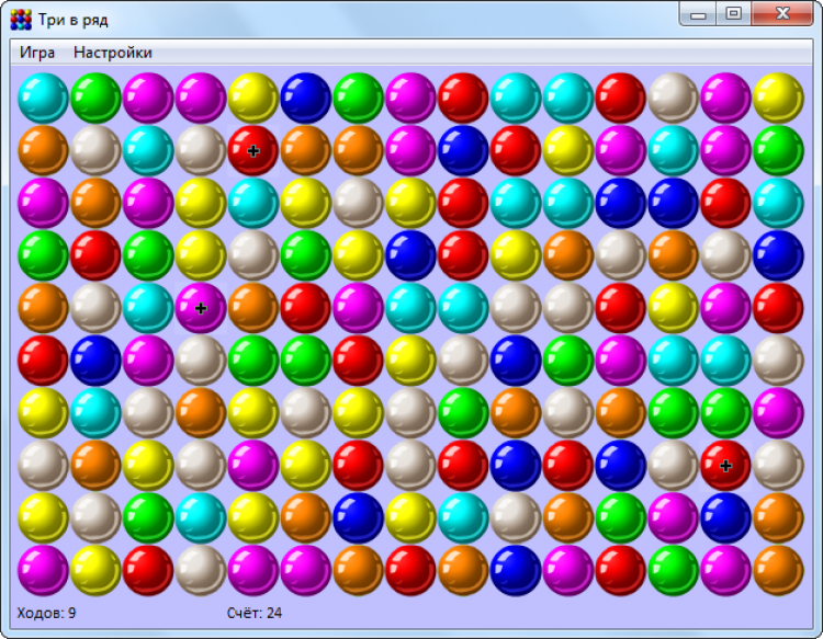 Три в ряд - это игра, где вам нужно двигать шарики на поле, составляя ряд из трёх и более одинаковых цветов. Одноцветные ряды удалятся, увеличив ваш счёт. Количество цветов изменит сложность игры. Внизу экрана показано оставшееся (на данный момент) количество ходов.