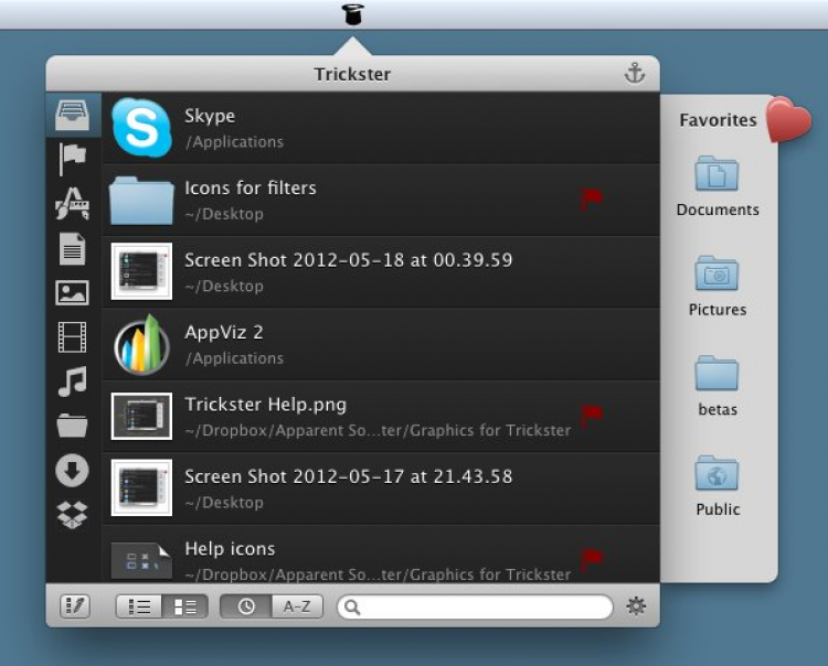 Trickster Обеспечивает быстрый доступ к недавно использованным файлам, папкам и приложениям. Trickster отслеживает все файлы, с которыми работает пользователь, так что они всегда остаются под рукой. Доступ к этим файлам обеспечивает список, выпадающий при нажатии на иконку в строке меню. Файлы из этого списка пользователь может открывать, просматривать, перемещать и т.д.