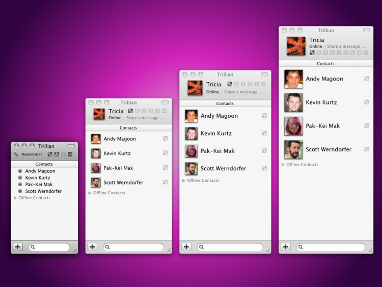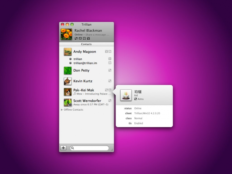 На борту программы имеются все мыслимые функции, которые вообще можно внедрить в программу данного толка и даже чуть больше. Разработчики насчитали более 400 функций программы. Программа поддерживает все популярные системы интернет-пейджинга: ICQ, Windows Live, Yahoo!, AIM, Google Talk и Jabber, а также такие сервисы как: Skype, IRC, Facebook, Twitter, foursquare и электронную почту. Помимо этого, программа имеет собственную сеть Astra, открытый протокол которой был разработан с нуля. Trillian Astra имеет массу разнообразных настроек, приятный интерфейс поддерживающий скины и систему плагинов.
