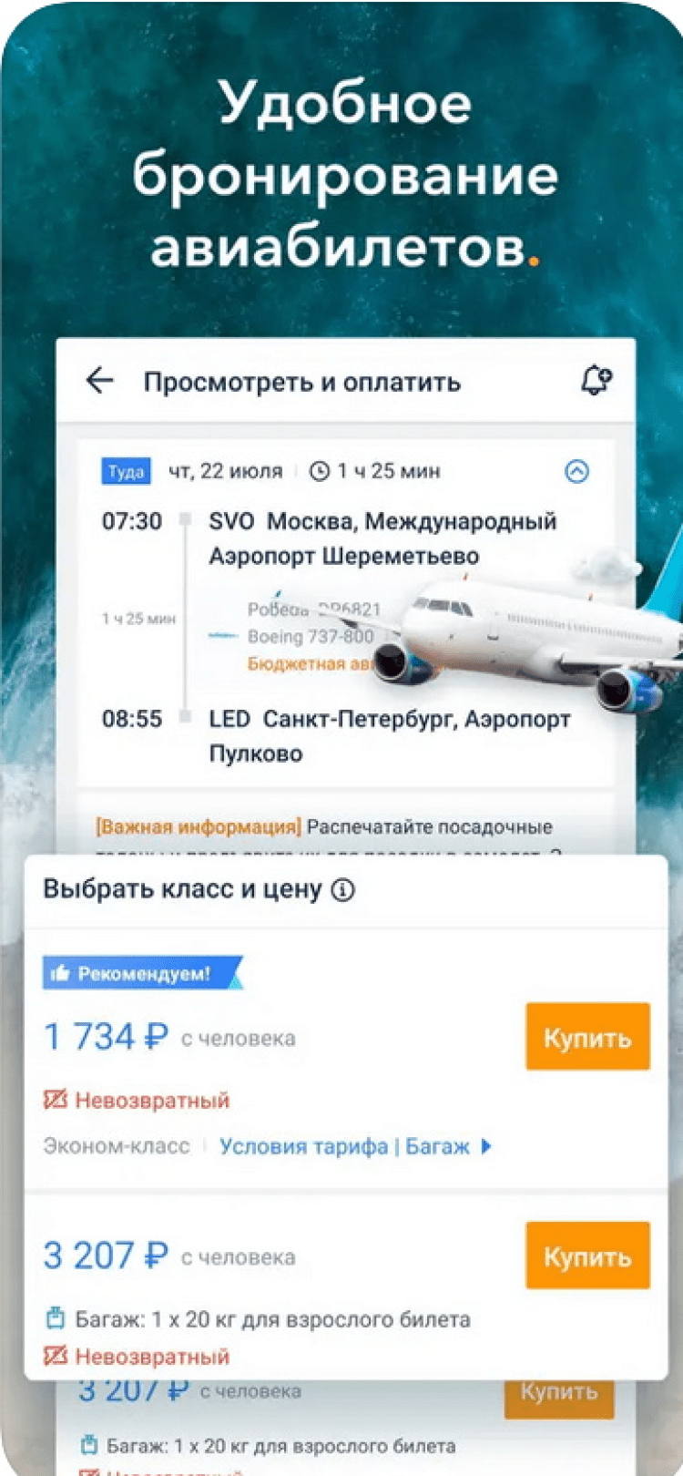 Главной особенностью программы является возможность искать выгодные цены на авиа, ж/д билеты, а также проживание в отелях, по всему миру. Теперь, вам не придется занимать место в памяти своего мобильного телефона, приложениями множества дополнительных сервисов: вся необходимая информация всегда будет у вас под рукой. Воспользуйтесь удобным поиском с поддержкой фильтров, чтобы найти наиболее подходящие для вас варианты размещения, либо поездки или перелета и забронируйте их, прямо с экрана мобильного телефона или планшета.