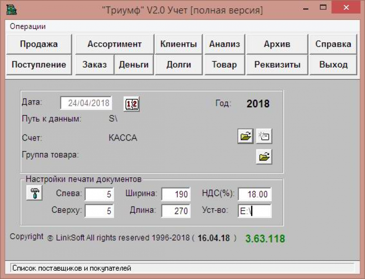 Триумф Программа предназначена для оперативного учета товара и денег. Можно вести учет на складе, магазине или торговой точке, контролировать долги, остатки товара, вести учет продаж и поступления товара, расход денег и поступление денег. Вы сможете контролировать своих продавцев в магазине или на рынке.