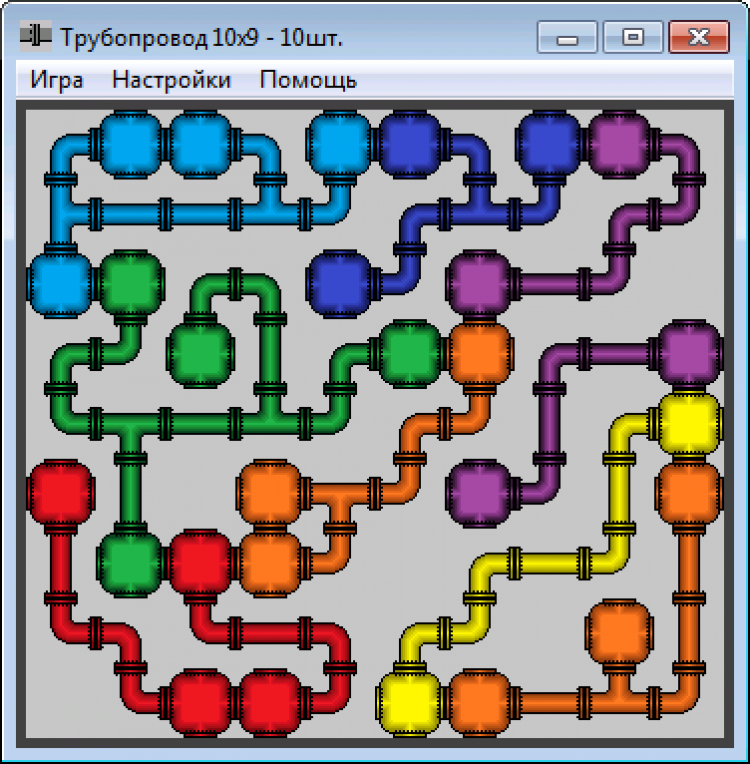 Трубопровод - это игра, в которой поворачивая трубы, проложите трубопровод между цветными ёмкостями (красный с красным, синий с синим и т.д.). Правильно проложенный трубопровод перекрасится в цвет ёмкостей. Использование тройников увеличит количество соединяемых ёмкостей. В меню «Настройки» можно менять размер и количество труб (от 1 до 10), размер поля, длину трубопроводов, попробовать трубопроводы без тройников. Поворачивать трубы можно также стрелками на клавиатуре, наведя курсор на трубу.