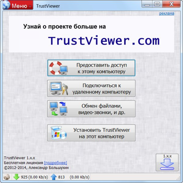 TrustViewer может работать без установки на компьютере, в этом случае все настройки связанные с подключением через интернет будут выполнены автоматически. Для предоставления доступа к своему компьютеру – необходимо запустить TrustViewer, выбрать режим сеанса связи “Предоставить доступ к этому компьютеру”, выбрать один из трех режимов доступа к вашему компьютеру (“Только просмотр рабочего”, “Совместное управление” или “Полный доступ”), и сообщить партнеру уникальный для каждой сессии девятизначный идентификатор. Соответственно, для управления удаленным компьютером, после запуска TrustViewer необходимо выбрать режим сеанса связи “Подключиться к удаленному компьютеру” и ввести полученный от партнера идентификатор сессии. Доступен также паритетный сеанс связи, при котором каждый из операторов в любой момент может запросить у партнера любой режим работы и уровень доступа, для этого, после запуска TrustViewer, каждый из операторов выбирает режим сеанса связи “Обмен файлами, видеозвонки и др.”, и один из них сообщает другому свой идентификатор сессии.