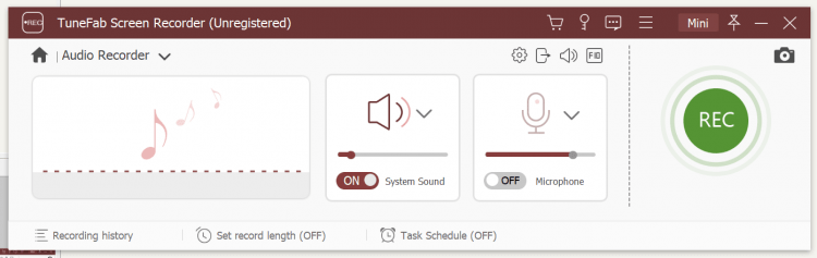 TuneFab Screen Recorder может записывать просто звук без видео. В качестве источника звука может быть система или микрофон. Можно записывать и то и то параллельно. Уровень громкости можно регулировать по отдельности.