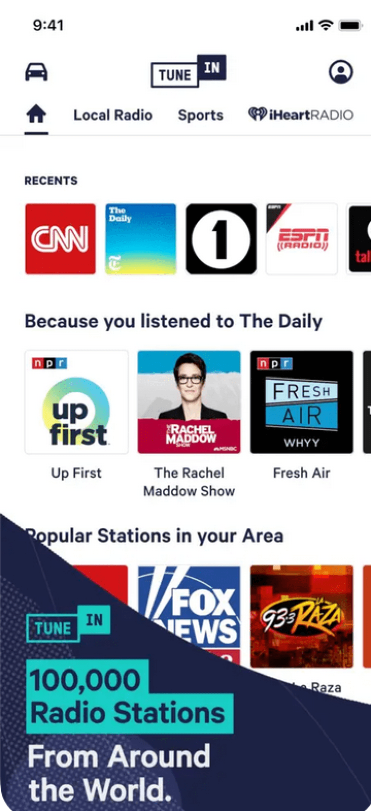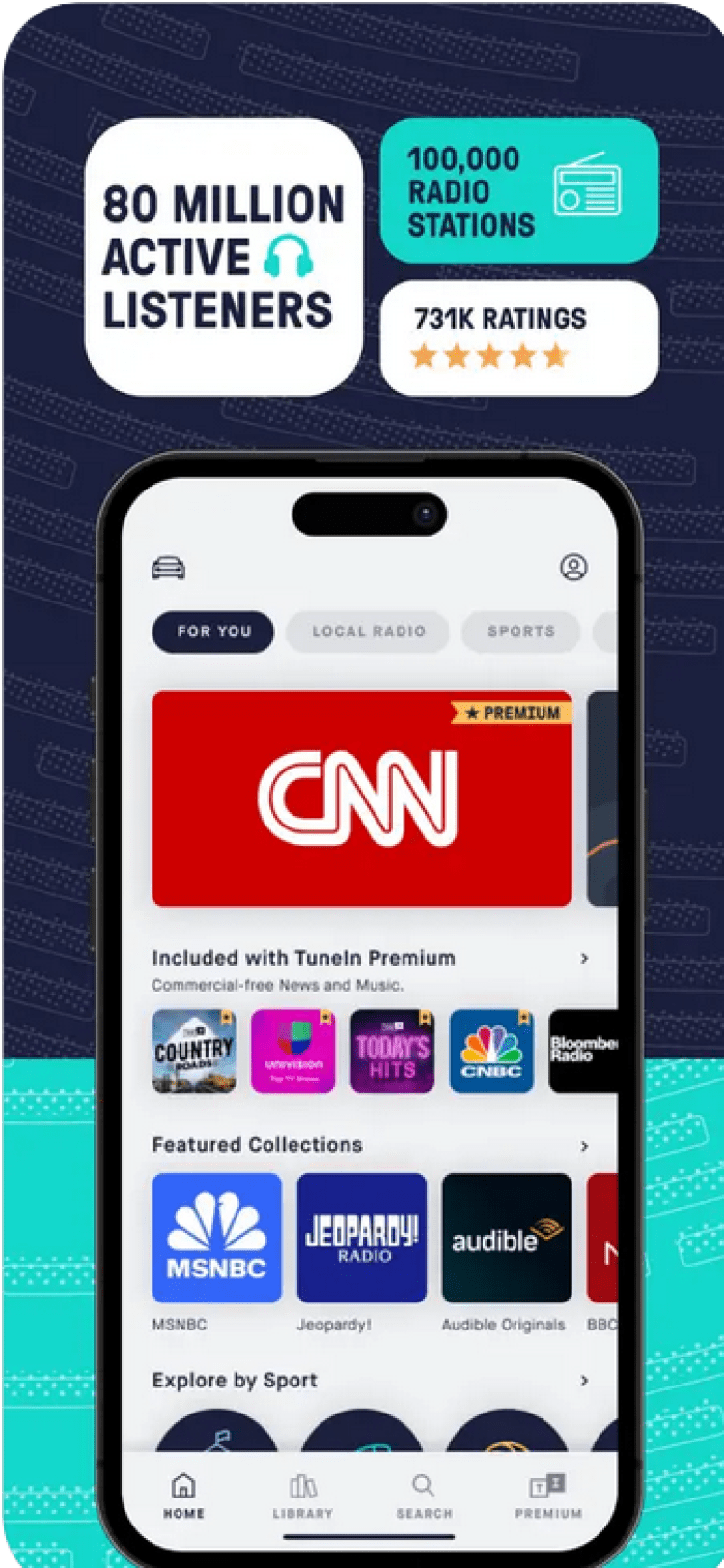 TuneIn Radio — эта программа позволит вам слушать более 100000 радиостанций со всего мира при помощи своего мобильного устройства. Добавляйте понравившиеся радиостанции в избранное для получения более быстрого доступа к ним и слушайте любимую музыку или передачи в любом месте и в любое время. Так же вы сможете воспользоваться функцией будильника, благодаря которой вы сможете просыпаться под музыку любимой станции.