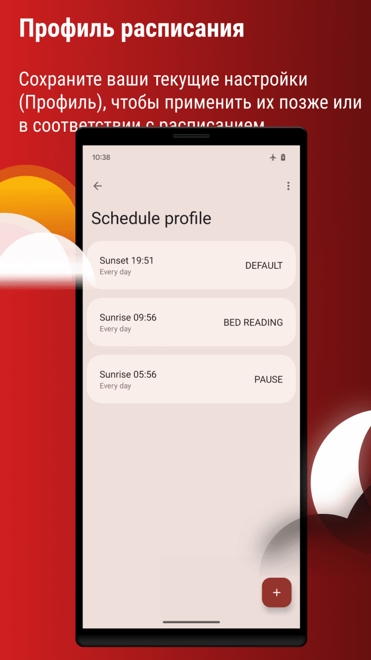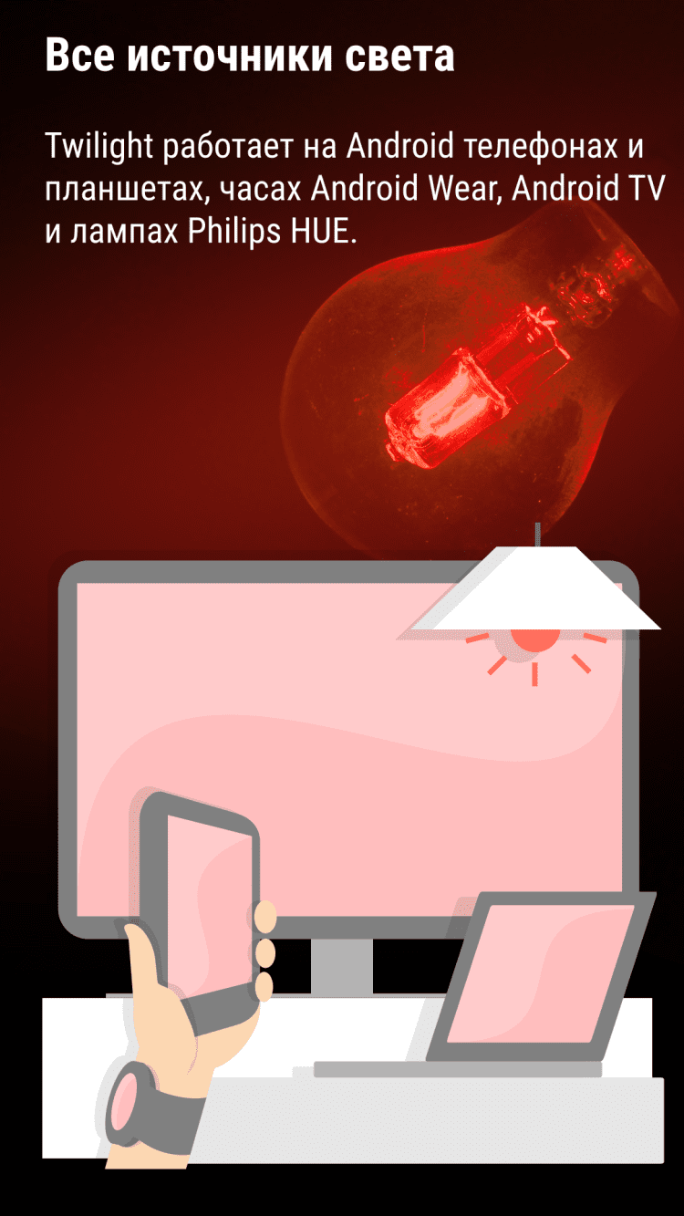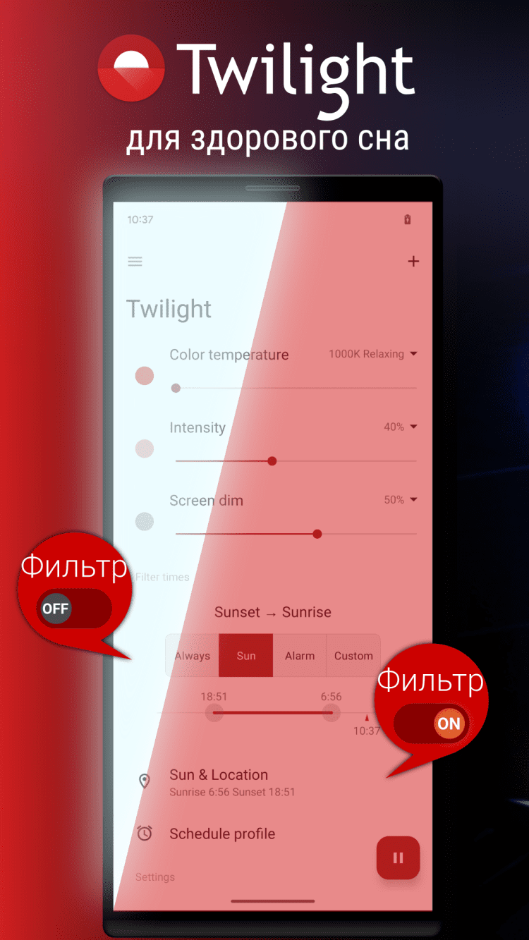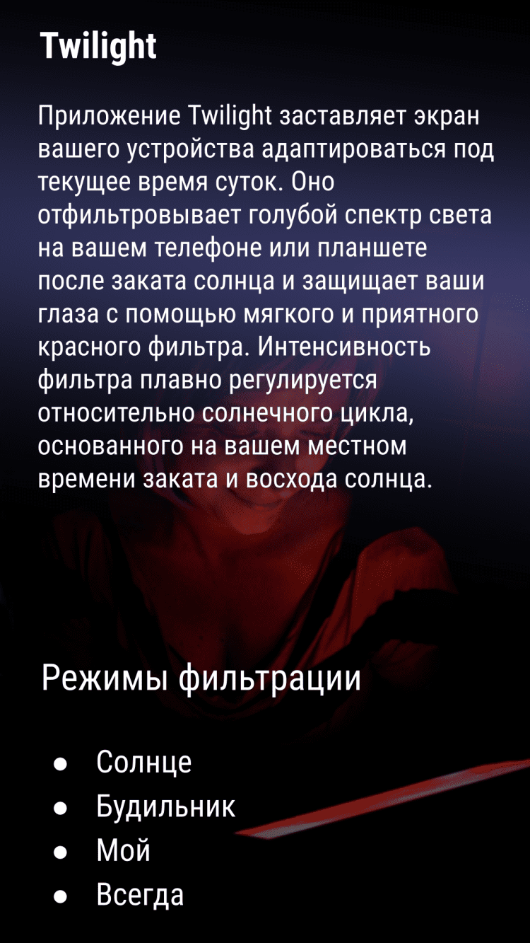 Twilight Программа, которая поможет вам быстрее и легче заснуть, используя при этом ваше мобильное устройство. Доказанный факт, что голубой цвет подсветки с экрана мобильных устройств оттягивает процесс наступления сна в среднем на час. Данное приложение автоматически будет подстраивать цветовую палитру в более благоприятный для засыпания режим.