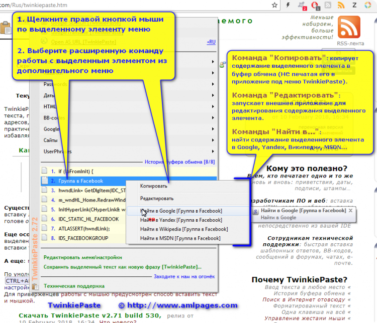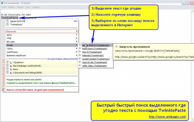 Найти выделенный текст в Интернете, перевести в Google Translate, отправить по электронной почте: всё это удобно и быстро сделать с помощью TwinkiePaste. Выделите текст в любом приложении, нажмите клавишу и выберите соответствующую команду из меню вставки.