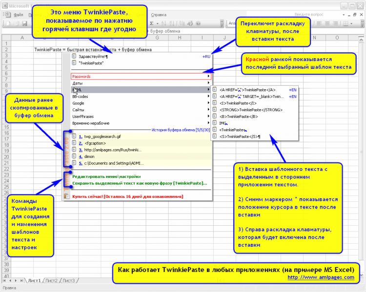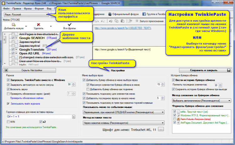 Это программа для быстрого ввода часто используемого текста, подписей, дат, приветствий, шаблонных ответов, интернет-адресов, логинов и паролей. TwinkiePaste помогает быстро вводить текст практически в любые приложения, тем самым экономя уйму времени и избавляя вас от рутины.