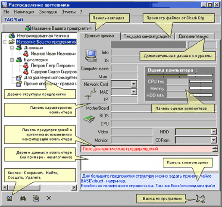 Учет и контроль компьютеров в сети предприятия - это программа для автоматического сбора, учета и контроля аппаратнопрограмных конфигураций компьютеров в смешанных (Novell+WinNT) сетях, под Win9x-WinXP. Присвоение инвентаризационных номеров, учетные карточки комп., требование на перемещение и прочие отчеты. Контроль установки(удаления) программ, подключений к Интернету и пр.