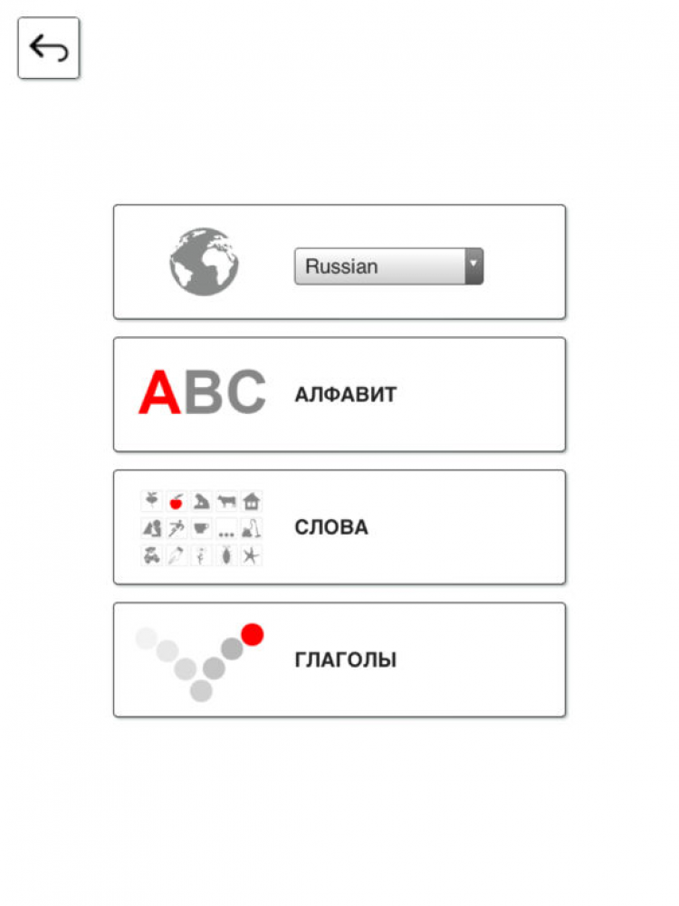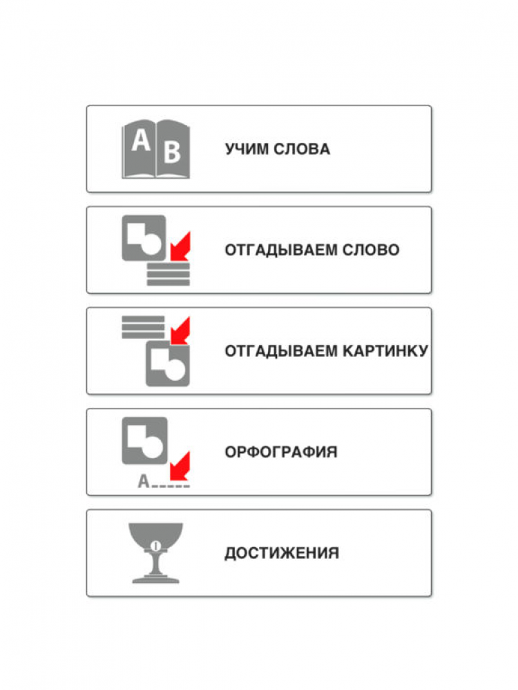 • Тренинг - запоминание алфавита, существительных, прилагательных, глаголов с транскрипцией при помощи карточек и звукового сопровождения.