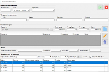 Для успешной автоматизации всех продаж вам нужно внимательно ознакомиться с функционалом, чтобы иметь представление, как работать с этой программой. На панели расположены иконки, используя которые вы сможете работать со всеми существующими функциями. Первая иконка — создание договора. Нажмем на нее и увидим новое окно, куда требуется ввести данные для заключения договора. В эти данные входят сведения о покупателе, название товара. О товаре не нужно вводить никакую дополнительную информацию: достаточно будет выбрать его из существующего списка.