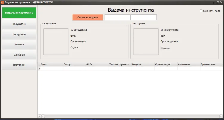 Сохраняется полная история выдачи инструмента по инструменту и по получателю.