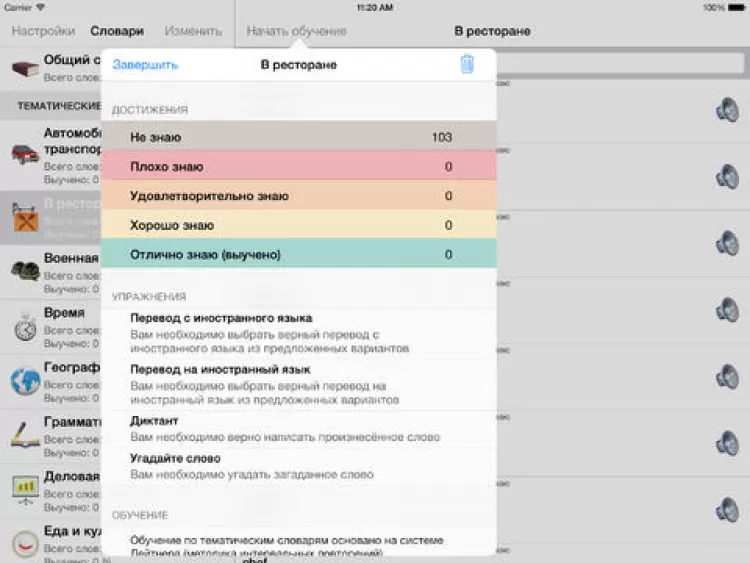- 4 варианта упражнений на выбор: "Перевод на русский язык", "Перевод на английский язык", "Диктант" и "Угадай слово".