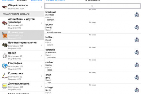 - 30 тематических словарей: Автомобили и другой транспорт, В ресторане, Военная терминология, Время, География, Грамматика, Деловая лексика, Еда и кулинария, Животные, Земледелие, Искусство, Камни и минералы, Медицина, Музыка, Названия стран, Наука и техника, Овощи и фрукты, Одежда, Погода, Путешествия и отдых, Растения, Семья, Спорт, Строительство, Хозяйство и быт, Цвета, Часто употребляемые слова, Чувства и эмоции, Школа, Языки.