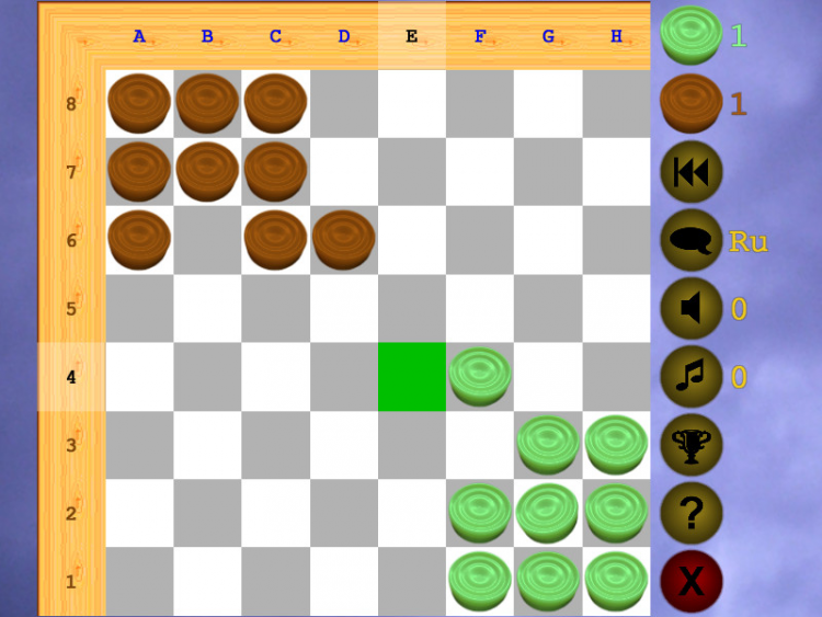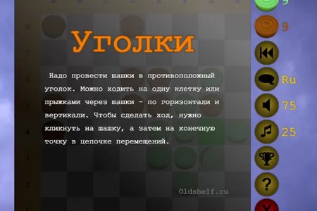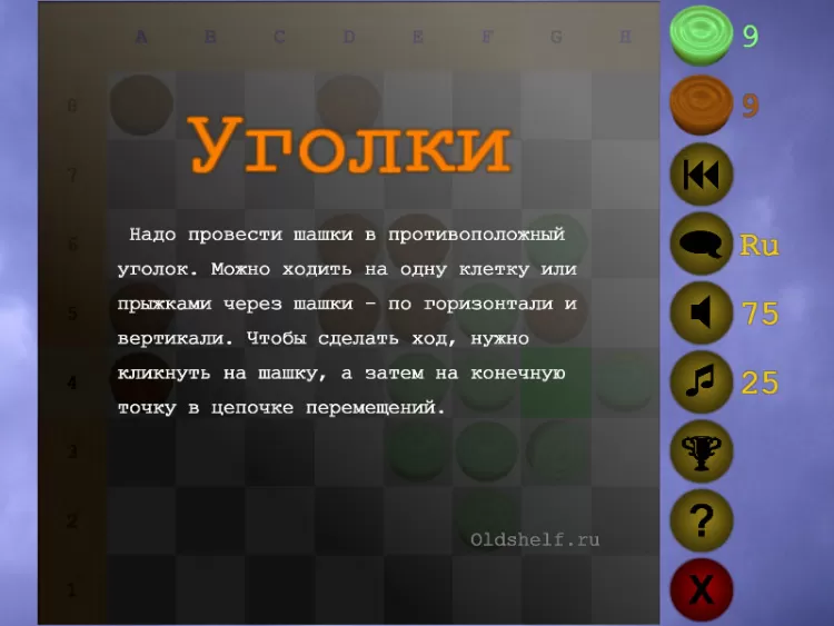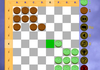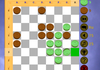 Правила. Надо провести шашки в противоположный уголок. Выигрывает тот, кто сделает это первым. Можно ходить на одну клетку или прыжками через шашки - по горизонтали и вертикали.