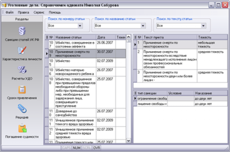 Уголовные дела. Справочники адвоката Николая Сабурова - это программа "Уголовные дела. Справочники адвоката Николая Сабурова" предназначена для адвокатов, работников правоохранительных органов и граждан. Расчет рецидива, тяжести преступлений, сроков давности по уголовным делам, текст УК РФ по уголовному кодексу РФ.