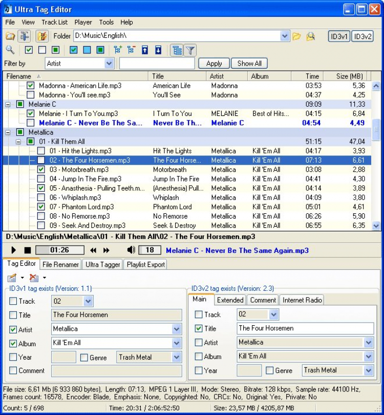 Ultra Tag Edito - это редактор MP3 и OGG тэгов, который обладает рядом полезных возможностей. Программа позволяет генерировать тэги по имени файла или переименовывать файлы, основываясь на информации из тэгов, поддерживается работы CDDB, имеется возможность переводить информацию из одного формата в другой, присутствует экспорт информации в файлы HTML, XLS и CSV. Встроенный плеер позволяет быстро приводить в порядок музыкальную коллекцию.