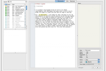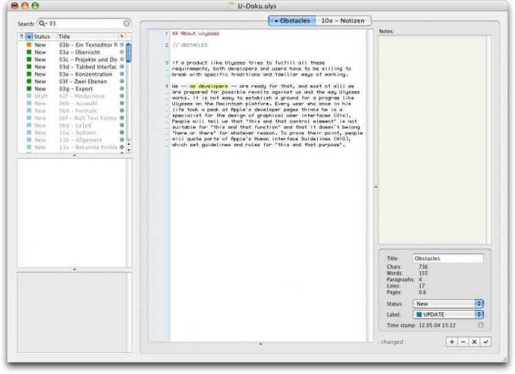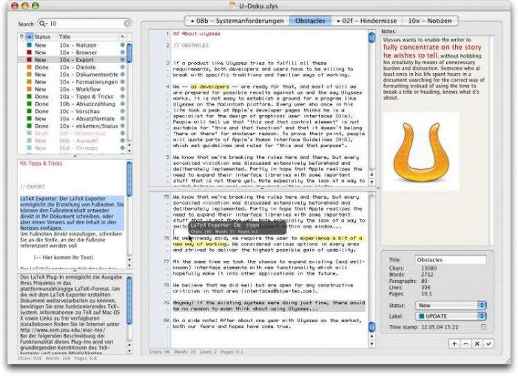 Ulysses Уникальный текстовый редактор, предназначенный в певую очередь для писателей, романистов и всех, кто профессионально занимается написанием текстов. Ulysses обладает инновационным "вкладочным" интерфейсом, интегрированным блокнотом, браузером документов, и возможностью просматривать несколько документов одновременно. Ulysses позволяет писателям целиком и полностью сосредоточиться на самом тексте, не отвлекаясь на форматирование и прочую мелочь.