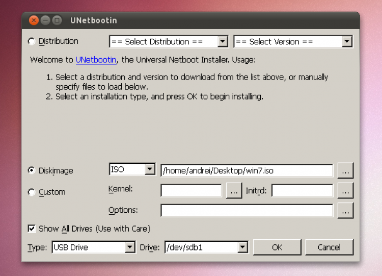 А если у вас уже есть ISO образ дистрибутива, то вы можете просто указать UNetbootin к нему, выбрать носитель и начать процесс установки.