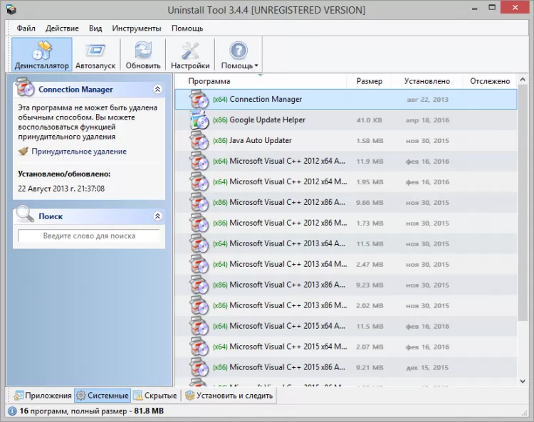 - удалять скрытые и системные программы, а также программы с поврежденным деинсталлятором;