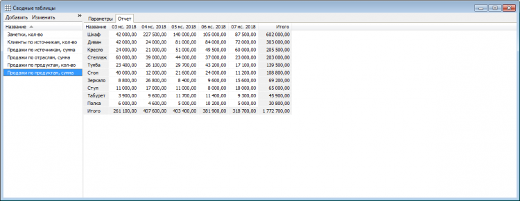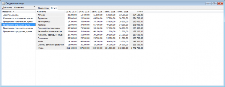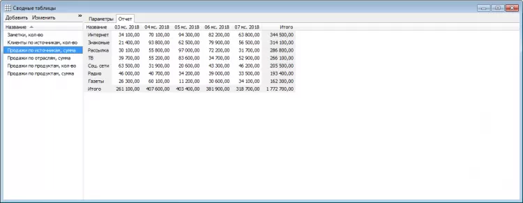 - Отчеты. Почти как сводные таблицы в Excel. По любым данным в базе.