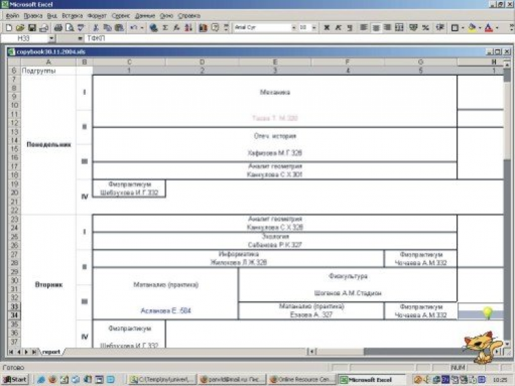 Университет - это программа для составления расписания ВУЗа с учетом направлений, смен и расположения аудиторий в разных корпусах в ручном и автоматическом режимах. Производится учет занятости преподавателей и аудиторий, осуществляется привязка аудиторий к дисциплинам. Число групп и подгрупп устанавливается индивидуально для каждого курса каждой специальности. Результат выводится на печать в форматах XML, HTML, MsWord, ASCII, MsExcel в т.ч. в цвете.