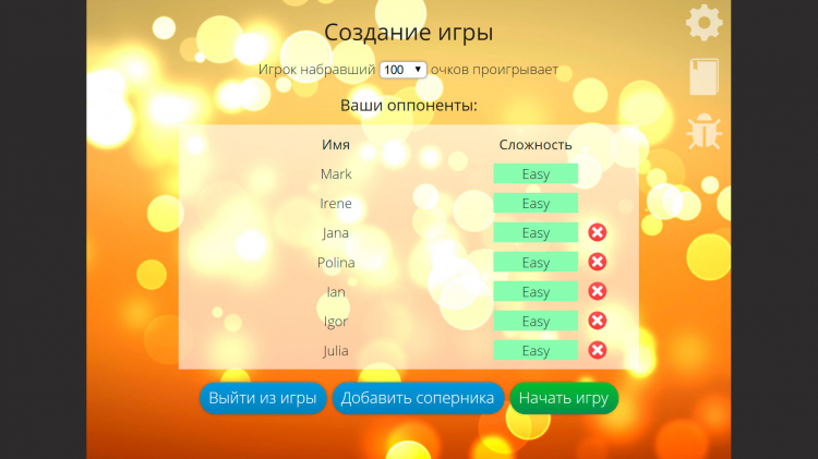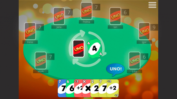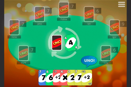 В игре вам предстоит столкнуться с виртуальными игроками - число которых может варьироваться от 2 до 7, а также у них меняется уровень сложности от лёгкого (easy) до сложного (hard). Если вы не знаете правили игры или забыли их - внутри игры вы сможете с ними ознакомиться и будете иметь представление как играть в УНО.