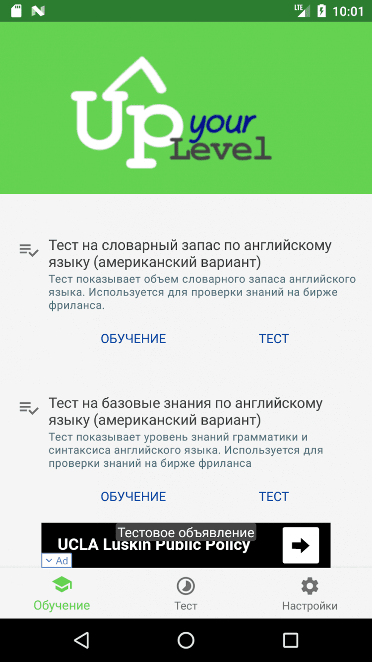 UpYourLevel English — это программа для тренировки прохождения тестов по английскому языку. Не самым правильным, но зато самым действенным способом для сдачи каких-либо тестов является самое простое заучивание вопросв и ответов. В этом случае, вы можете довести до автоматизма сам процесс прохождения тестов, ознакомиться с ответами и, тем самым, отбросить страх перед самим тестированием. Ведь, как известно, немалую роль в результатах любого испытания играет эмоциональный настрой и уверенность в себе.