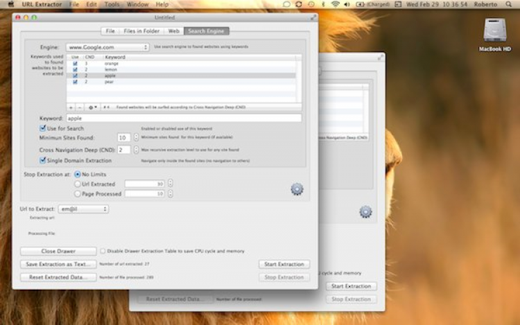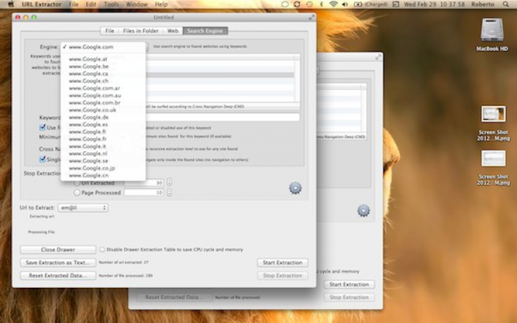 URL Extractor сканирует целиком всею страницу, находит все ссылки и электронные адреса и сохраняет их на жесткий диск. При этом программа работает полность в автоматическом режиме и не требует в процессе участия пользователя. Так же, используя поисковые сервисы, URL Extractor может искать страницы по ключевым словам и изклекать из сслыки и адреса.